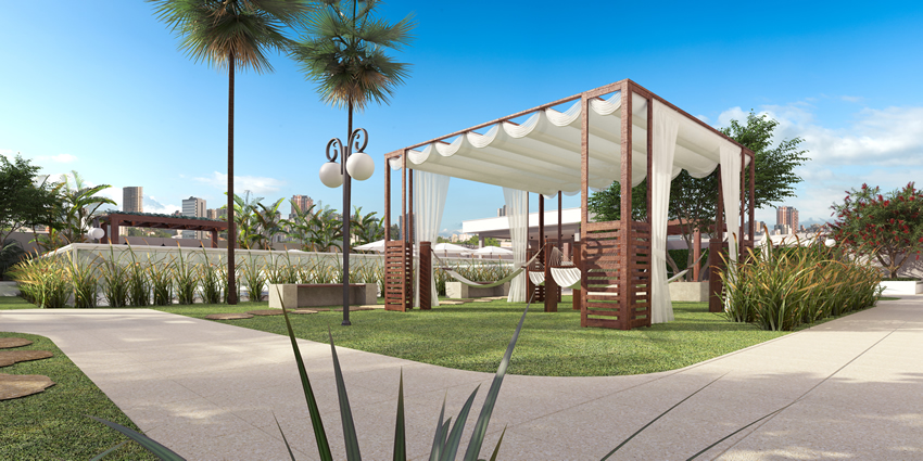 Grande área de lazer com espaços exclusivos, muito verde, plantas nativas e uma vista previlegiada da